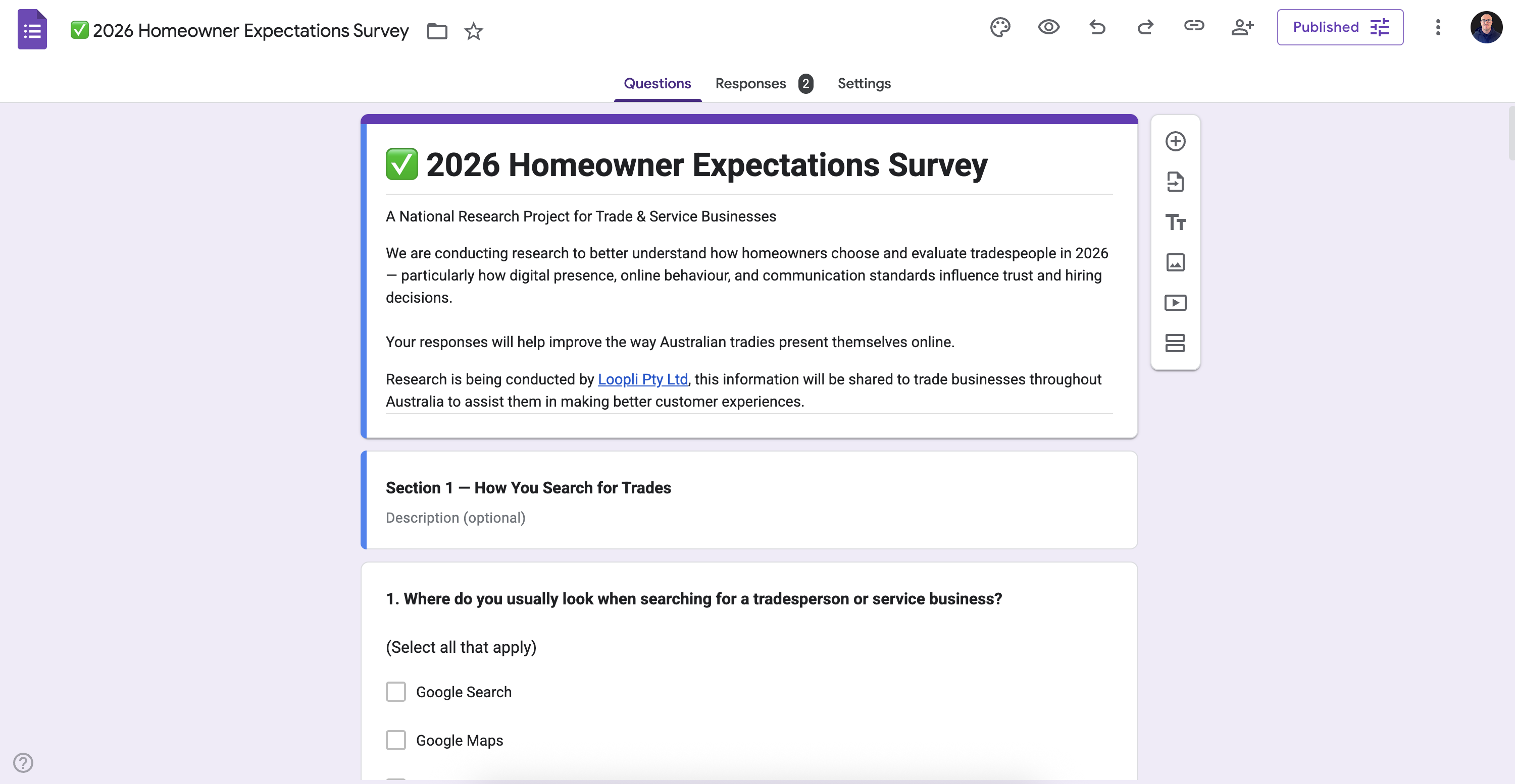 Your responses will help improve the way Australian tradies present themselves online.Research is being conducted by Loopli Pty Ltd, this information will be shared to trade businesses throughout Australia to assist them in making better customer experiences.